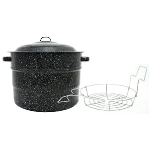 Six generations of Americans have been using Granite Ware canners to preserve fruits and vegetables. The dark porcelain surface and steel core absorbs energy and evenly distributes heat to the contents. The actual result is a canner that heats rapidly. The canner is ideal for preserving tomatoes or fruit, processing 7 quart jars with a time. Comes with rack for straightforward lifting jars from canner. Granite Ware's high efficiency, quick boiling performance combined with its modest cost make it ideal for canning. Porcelain enamel may be the results of fusing powdered glass to some substrate by firing, usually between 750 and 850 degrees Celsius. The powder melts and flows and hardens to some durable vitreous coating on the carbon steel core. It creates a smooth, hard finish that won’t burn and resists staining. It’s also non -porous so that it won’t trap odors or food particles and supplies a decreased coefficient of friction – meaning who's cleans up easily and, it is corrosion and chemically resistant so it's going to last a lengthy time. When fired, the vessel is positioned on pins therefore the bottom and sides are hardened through the firing process into one smooth laminated glass surface. You might notice slight pin indentations in which the glass has flowed across the pin that sports ths base during firing. The pin marks don't compromise the finish or performance in the vessel in a way. Can be used on gas or electric stove tops. Not appropriate for glass stove tops. 21 1/2 qt capacity.